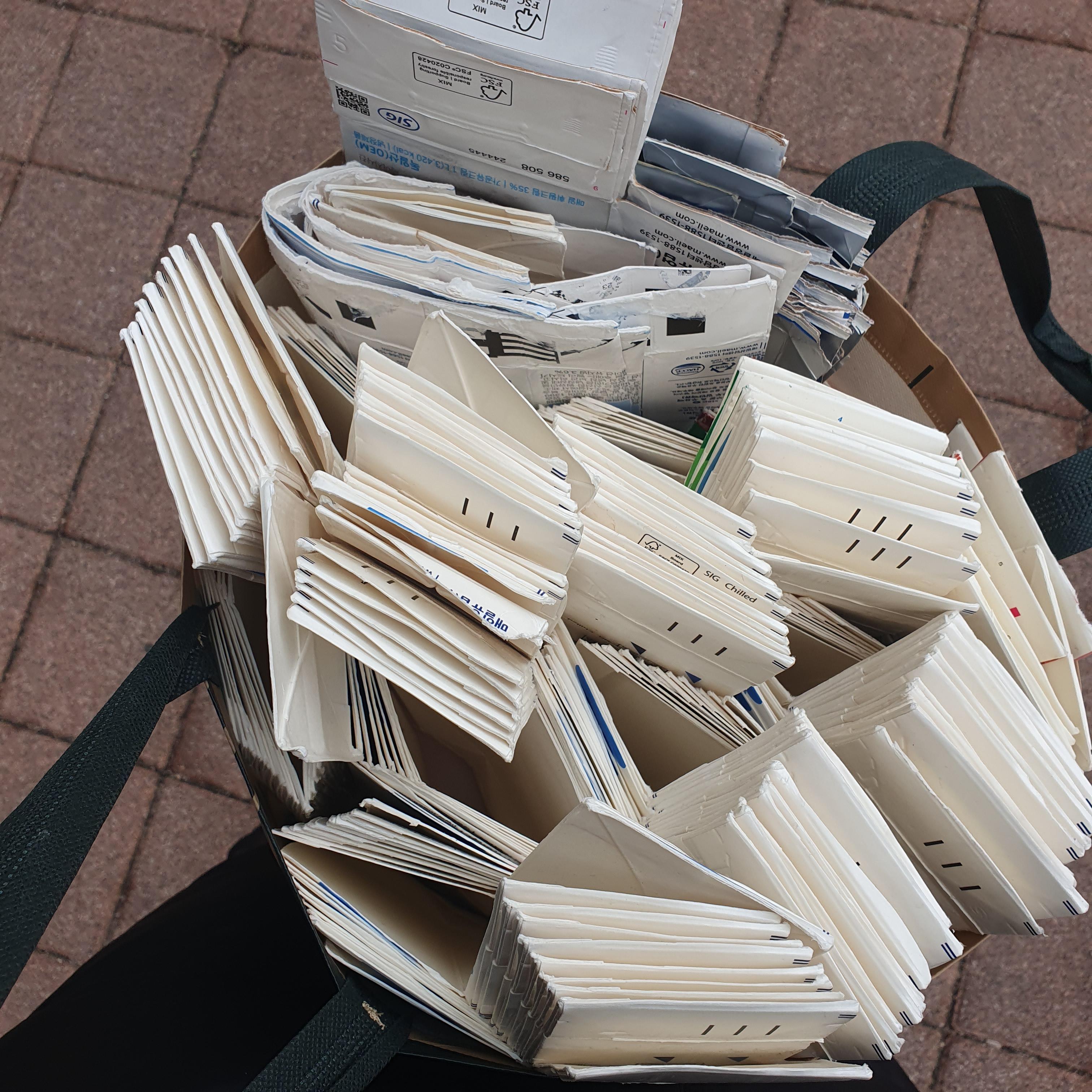 나는 우유갑(대:90개,중:10개,소:2개)와 멸균팩 20개를 열심히 들고 갔다.