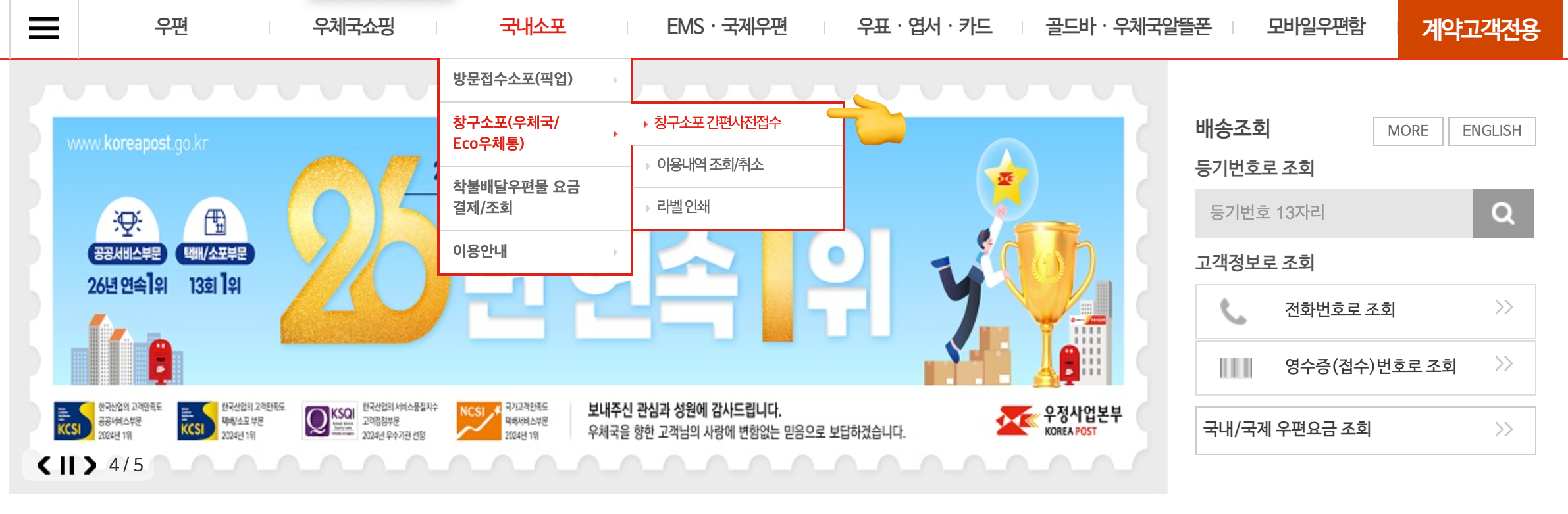 2. 상단 바에서 [국내소포 ▶︎ 창구소포 ▶︎ 창구소포 간편사전접수]로 들어가준다.