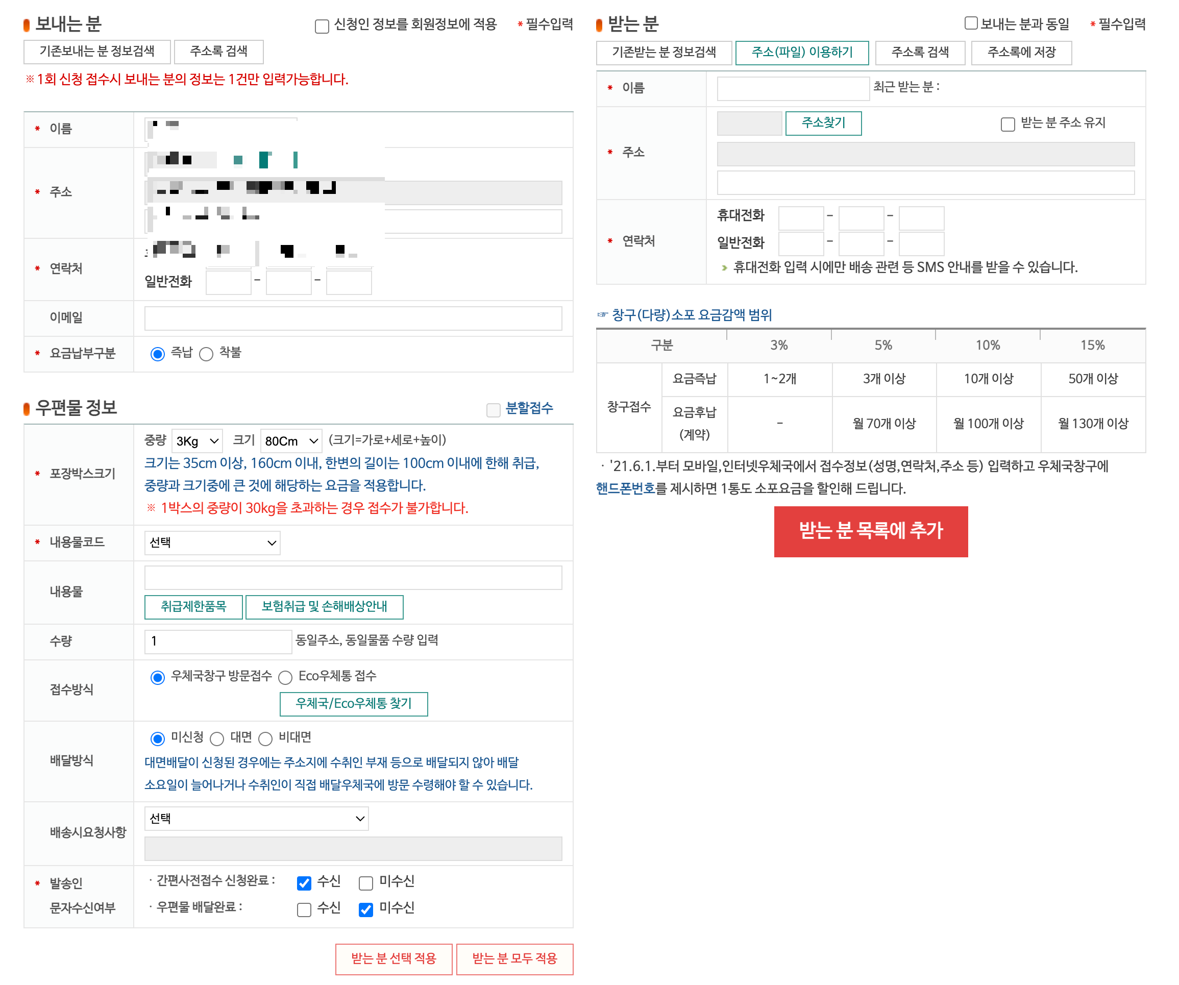 3. 아래 보내는 사람과 받는 사람, 우편물 정보 등을 입력해 주고 [받는 분 목록에 추가]를 눌러준다.